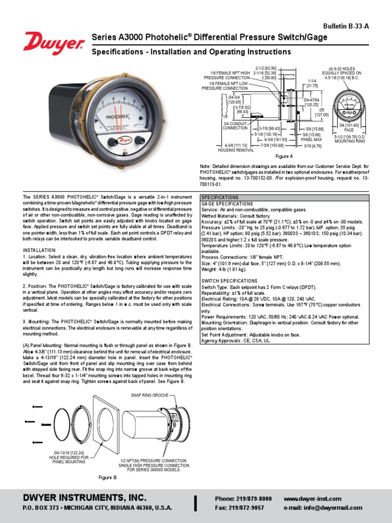 Series a3000 photohelic differential pressure switchgage specifications installation and operating instructions bulletin b 33 a the series a3000 photohelic switchgage is a versatile 2 in 1 instrument combining a time proven magnehelic differential pressure gage with lowhigh pressure switches. Standard models are rated to 25 psig 17 bar with options to 35 24 or 80. The photohelic switchgage measures and controls positive negative or differential pressures of air and compatible gases. Control fans dampers pumps etc between the set points of a photohelic sgt. The mini photohelic switchgage is designed to measure and control positive negative or differential pressures consisting of non combustible and non corrosive gases. Box 373 michigan city indiana 46361 usa.